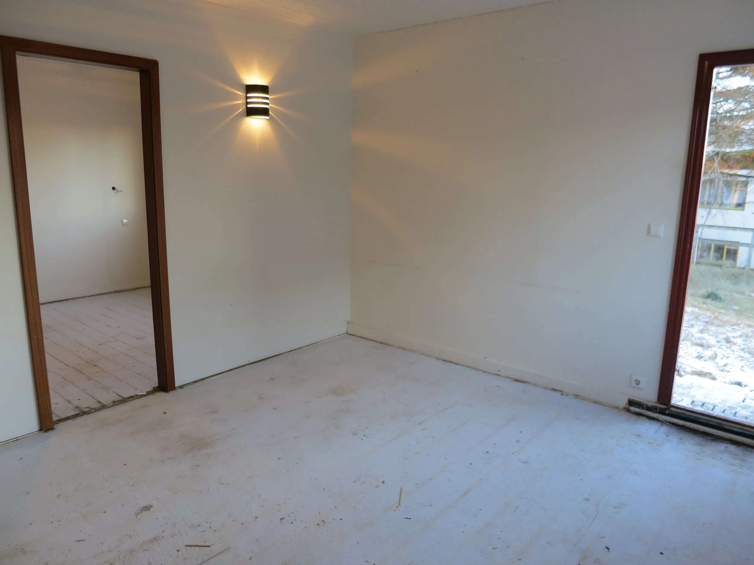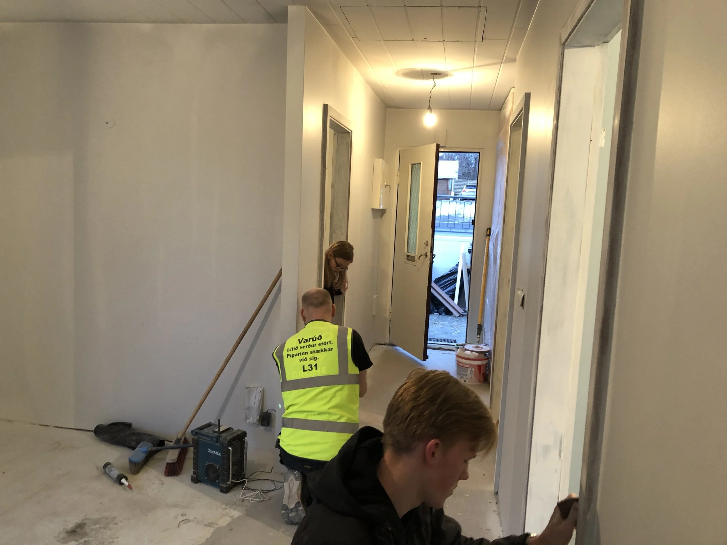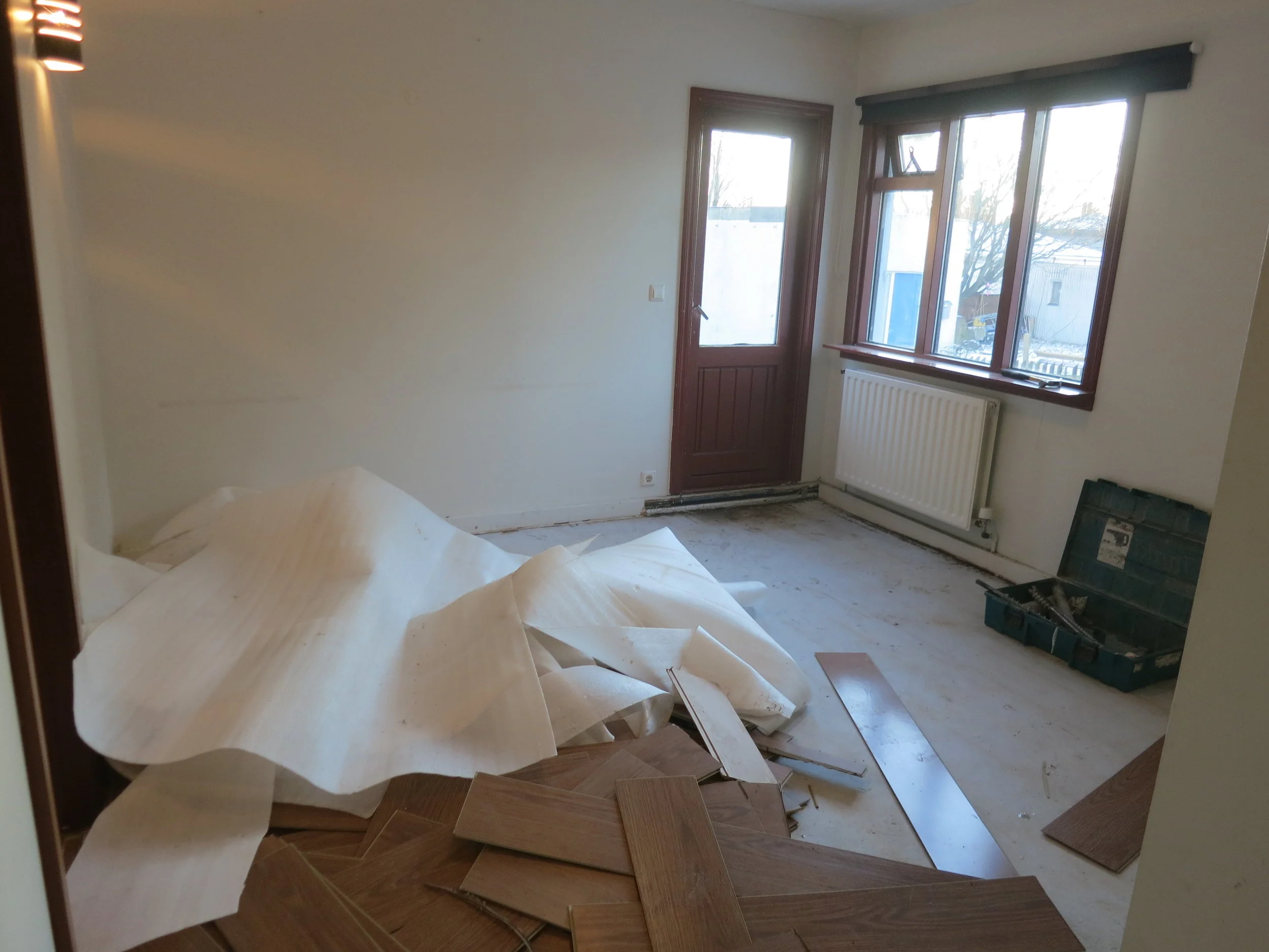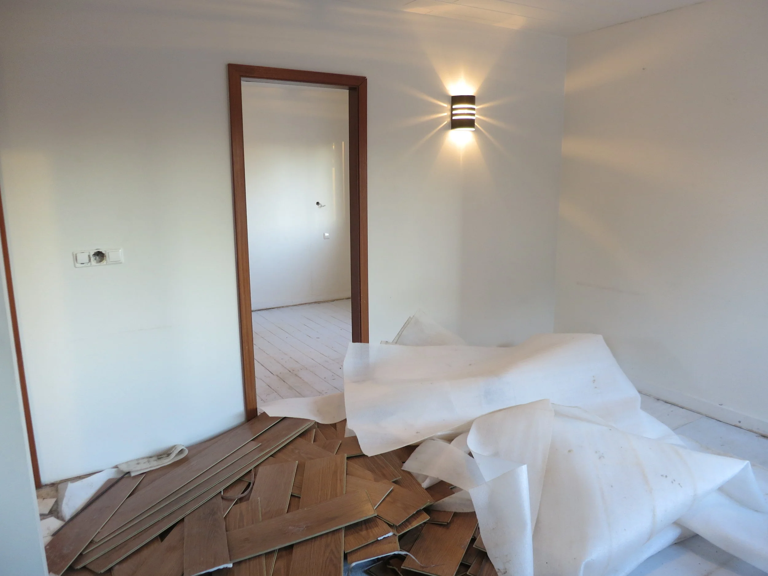 Þann 17. desember fengum við húsið loks afhent. Þá voru framkvæmdir í bílskúrnum enn í fullum gangi til að Óli gæti flutt beint þangað inn, því minna er plássið í húsinu. Svo þurfti að halda jól og afmæli og allskonar en það var svo á annan í jólum sem allt fór á fullt í litla húsinu. Þar þurfti svo sannarlega að taka til hendinni og húsið var vægast sagt í óaðlaðandi ástandi og lyktin var til dæmis viðbjóðsleg svo ekki sé sterkara að orði kveðið. Allar hurðar dökkar, gluggakarmar voru dökkmálaðir og á gólfum var minnst 20 ára gamalt plastparket sem var allt bólgið og snúið. Við brutum flísar af í forstofu og eldhúsi og rifum parketið af og að því loknu þurfti að flota part af gólfinu. Einnig ákváðum við að færa til hurðaropið á minna herberginu til að hjónarúmið kæmist þar fyrir með góðu móti, svo lítið er það herbergi. Krakkarnir fá nefnilega "hjónaherbergið" í húsinu því þau þurfa jú að deila herbergi á meðan á þessu ævintýri stendur.