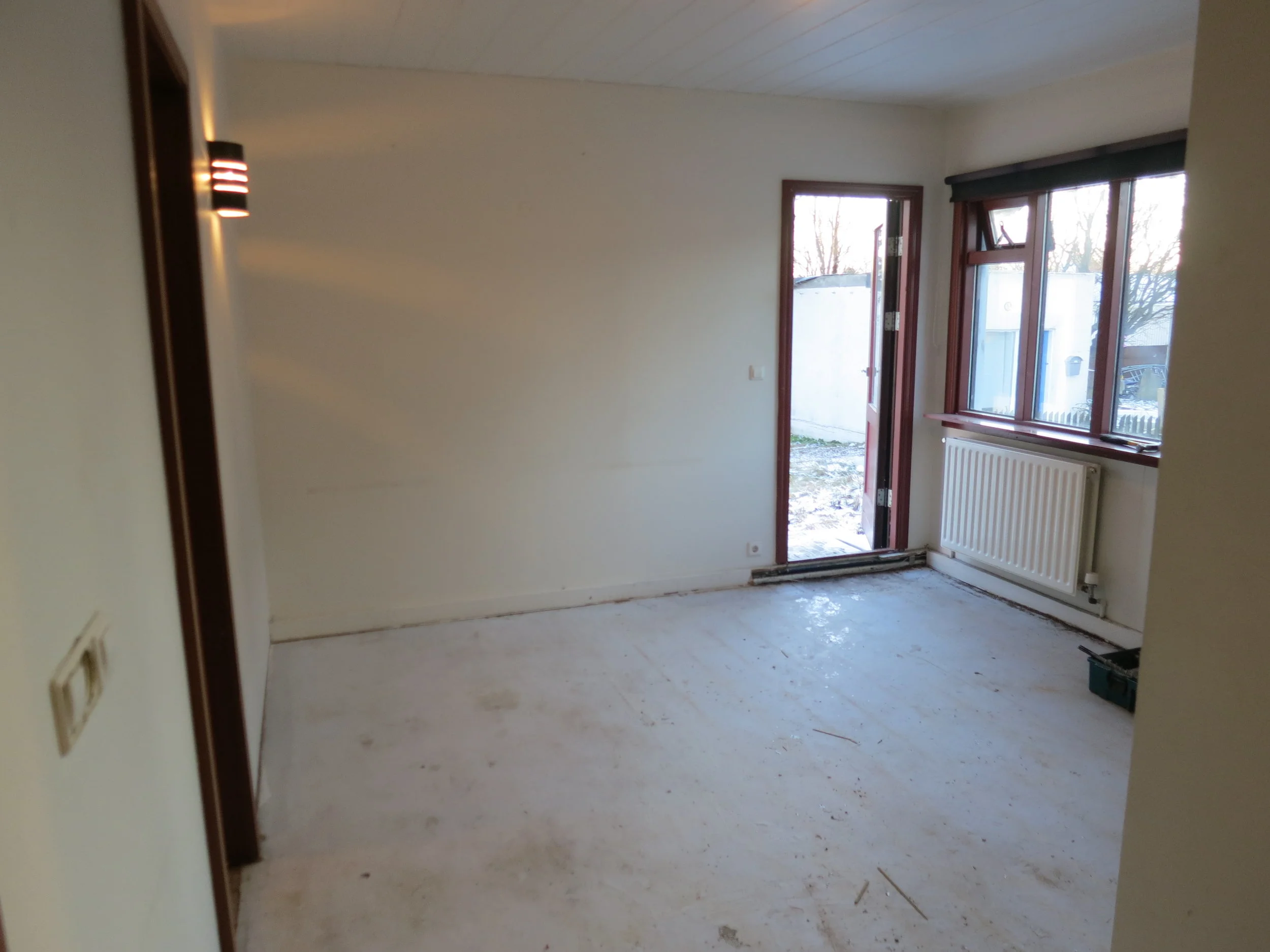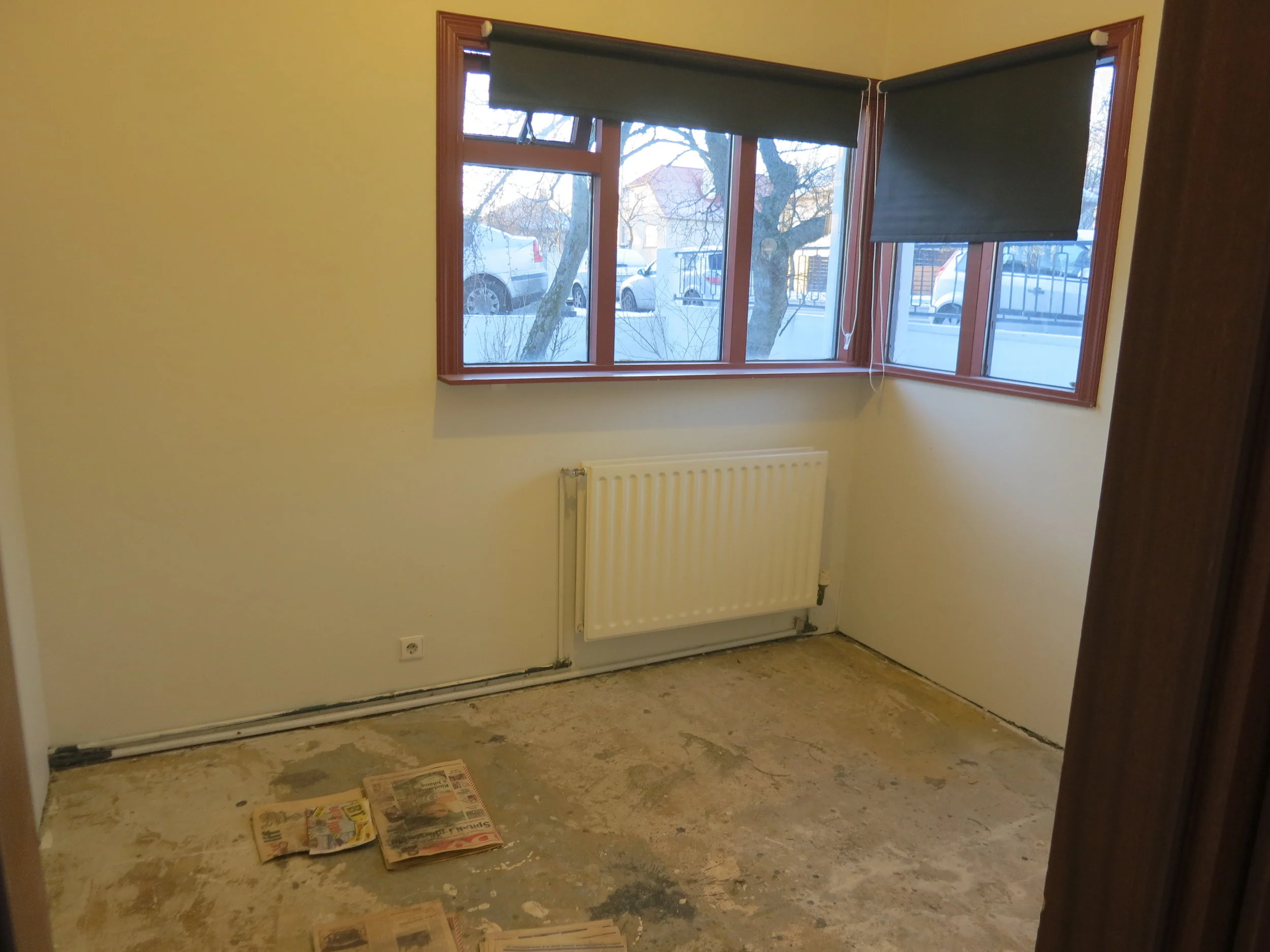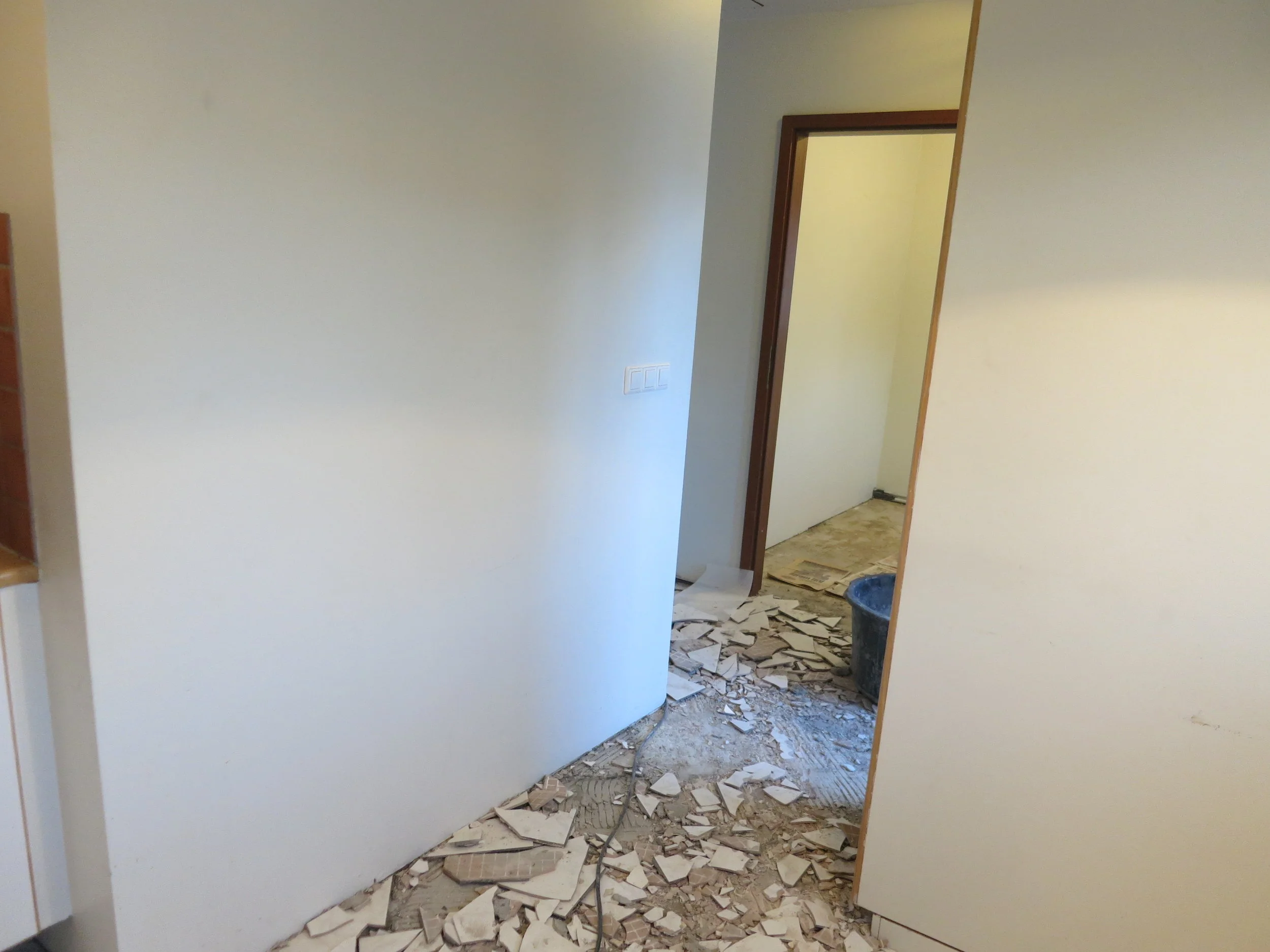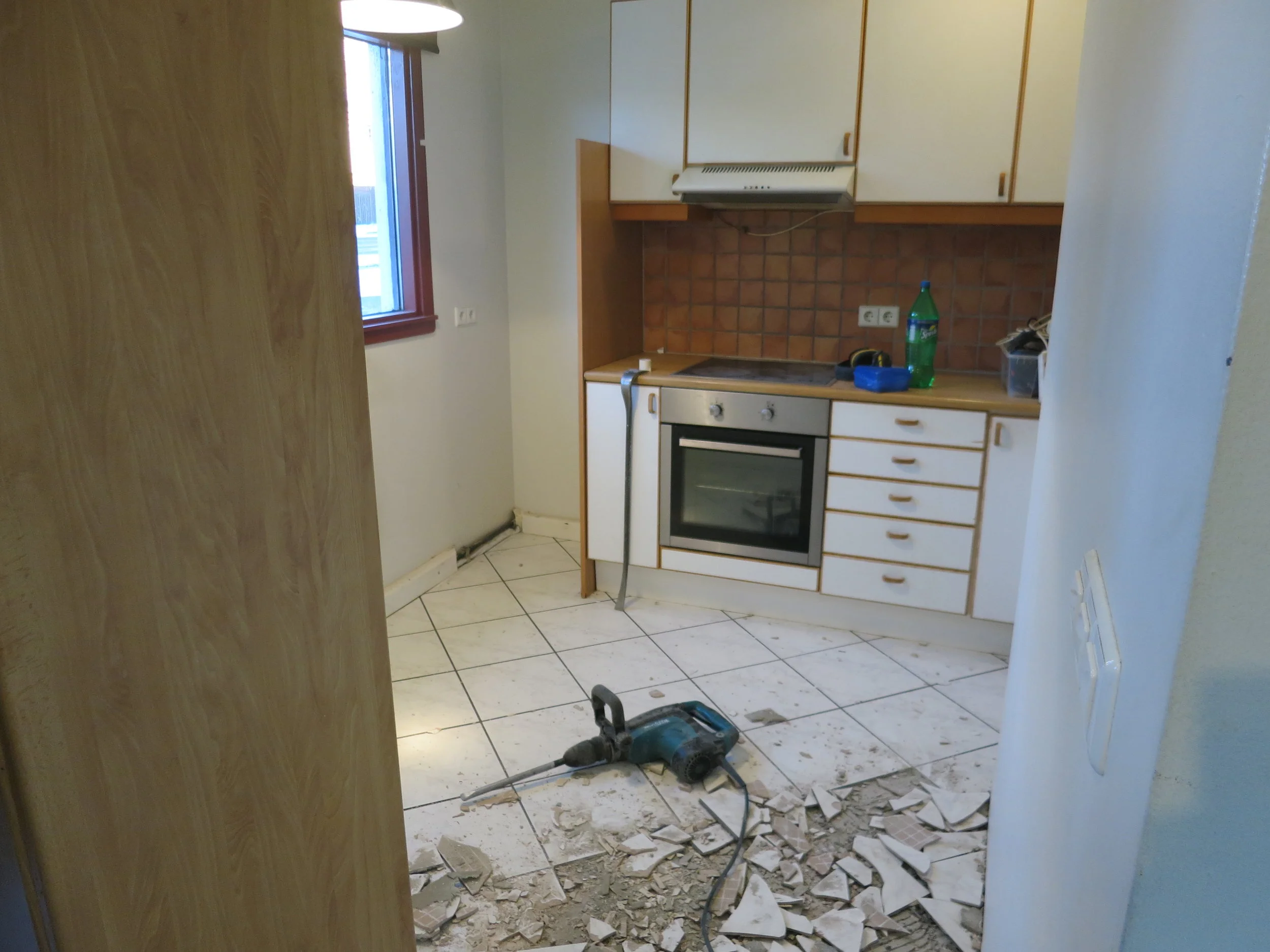 Þann 17. desember fengum við húsið loks afhent. Þá voru framkvæmdir í bílskúrnum enn í fullum gangi til að Óli gæti flutt beint þangað inn, því minna er plássið í húsinu. Svo þurfti að halda jól og afmæli og allskonar en það var svo á annan í jólum sem allt fór á fullt í litla húsinu. Þar þurfti svo sannarlega að taka til hendinni og húsið var vægast sagt í óaðlaðandi ástandi og lyktin var til dæmis viðbjóðsleg svo ekki sé sterkara að orði kveðið. Allar hurðar dökkar, gluggakarmar voru dökkmálaðir og á gólfum var minnst 20 ára gamalt plastparket sem var allt bólgið og snúið. Við brutum flísar af í forstofu og eldhúsi og rifum parketið af og að því loknu þurfti að flota part af gólfinu. Einnig ákváðum við að færa til hurðaropið á minna herberginu til að hjónarúmið kæmist þar fyrir með góðu móti, svo lítið er það herbergi. Krakkarnir fá nefnilega "hjónaherbergið" í húsinu því þau þurfa jú að deila herbergi á meðan á þessu ævintýri stendur.